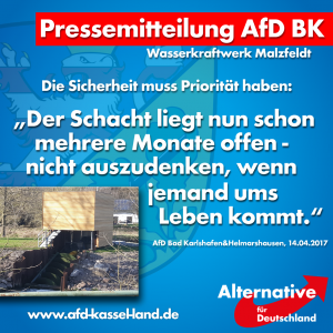 Der AfD Ortsverband Bad Karlshafen & Helmarshausen fordert die Betreiber des Wasserkraftwerkes Malzfeldt auf, wichtige Sicherheitsmaßnahmen an der neu errichteten Wasserschnecke am Diemelwehr, Höhe Krebs&Riedel, zu treffen. „Bereits vor Beginn der Arbeiten haben wir dieses sinnvolle Projekt unterstützt. Nun heißt es aber auch, das Projekt gefahrlos zu betreiben. Derzeit sehen wir leider absolute Gefahr für Leib und Leben“, schildert Florian Kohlweg, Sprecher der örtlichen AfD.