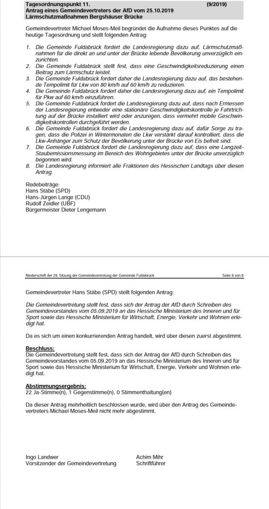 Warum wurde nicht bereits vor Jahrzehnten im Hessischen Landtag ein entsprechender Antrag gestellt um die Bürger vor den Gefahren zu schützen ? Wieso hat die SPD in über 20 Jahren keinen solchen Antrag im Landtag gestellt und wieso muss erst die AfD im Landtag und in der Gemeinde die Probleme der Brücke thematisieren?