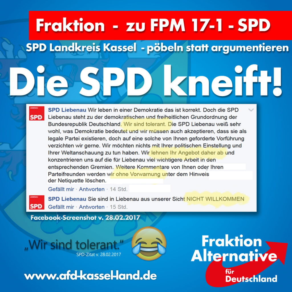 „Ja was denn nun, SPD? Erst gegen die AfD Stimmung machen, haltlose Vorwürfe in den Raum werfen und dann kneifen?“ zeigt sich Kohlweg, Fraktionsvorsitzender der AfD, sichtlich irritiert. Die SPD Liebenau hat der AfD unter der Woche Inhaltlosigkeit und Populismus vorgeworfen. Die AfD würde sich gegen die freiheitlichen Werte unserer Gesellschaft stellen und die Gesellschaft bewusst spalten.